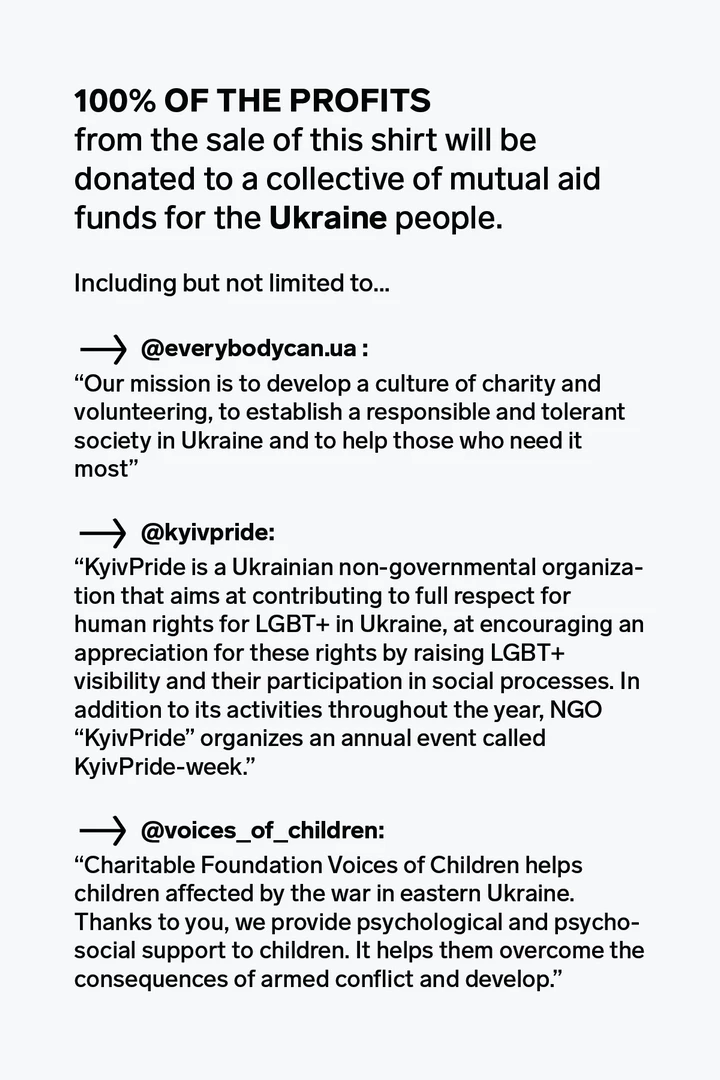 100% OF THE PROFITS from the sale of this shirt will be donated to a collective of mutual aid funds for the people of Ukraine.